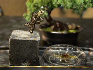 茶室の囲炉裏の沸点で淹れた紅茶に、焙じた落花生を加え、型にはまらないミルクを加え、茶道の侘び寂びの自然な状態をこのお茶碗に凝縮しました。